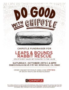 Please join us October 25th in raising funds for rabbit rescue! When you purchase yourself a delicious meal, the buns benefit. Show this flyer in restaurant, or order for pickup using code ZYMT2KQ @ the Chipotle location on Douglas Blvd from 4-8pm.